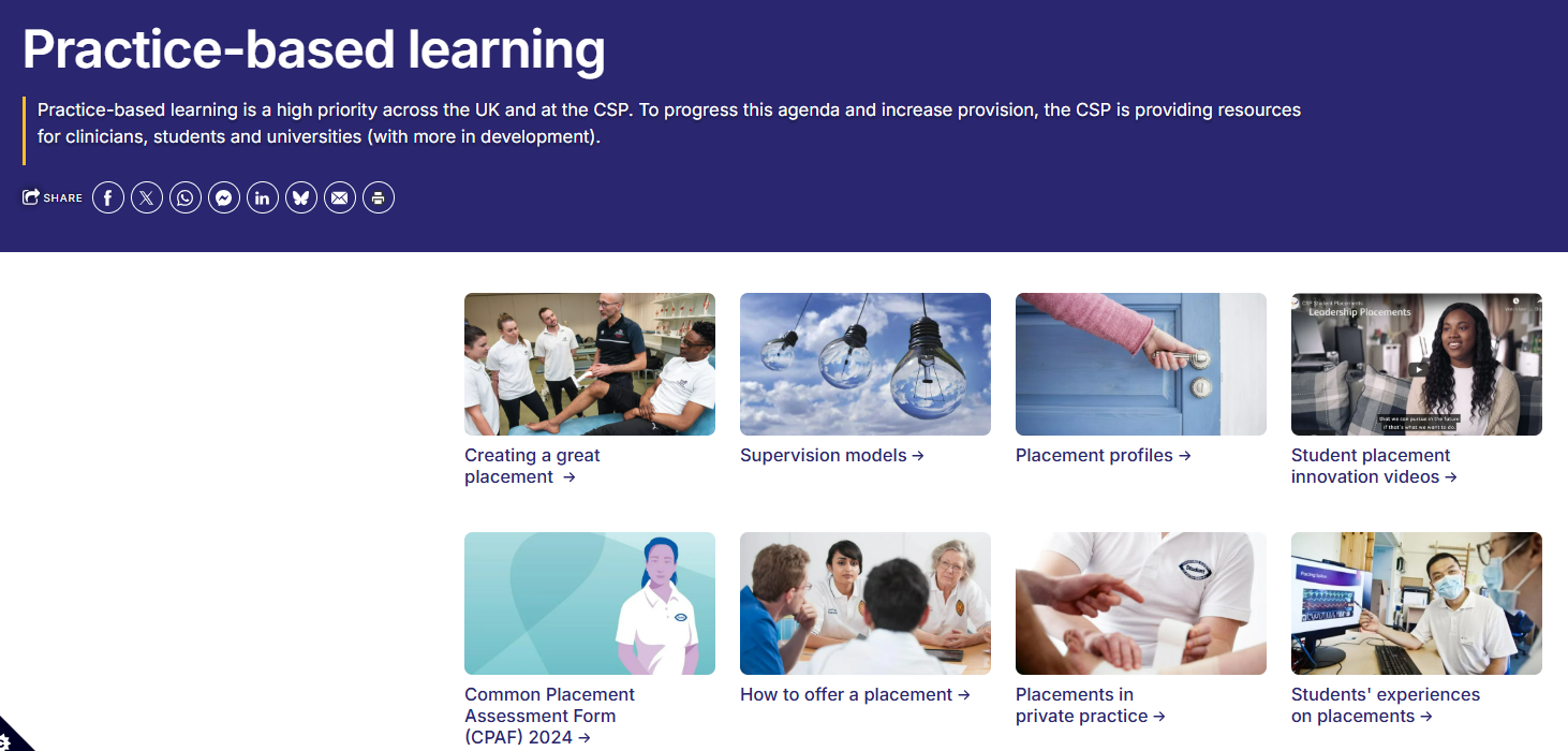 • Practice-based learning is a high priority across the UK and at the CSP. To progress this agenda and increase provision, the CSP is providing resources for clinicians, students, and universities.  Please click here to visit the resources.